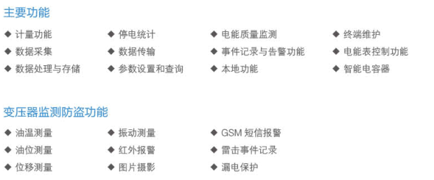 主要安裝于柱上變壓器臺區,具備對配電變壓器0.4kV低壓設備實現電能分配、電能計量、無功補償以及供用電信息的自動測量、采集、保護、監控及安全防護等功能。配變終端通過信息匯聚并上傳至配電自動化主站,具有“標準化、信息化、自動化、互動化”的智能化特征,實現智能臺區的精益化管理。