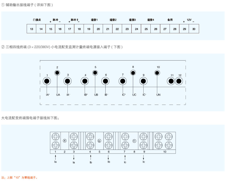 三相四線終端輸入為A、B、C三相電壓、N線(其額定值為220V)和A、B、C三相相電流(其額定值為5A,信號是從配變低壓側CT的二次接入)。